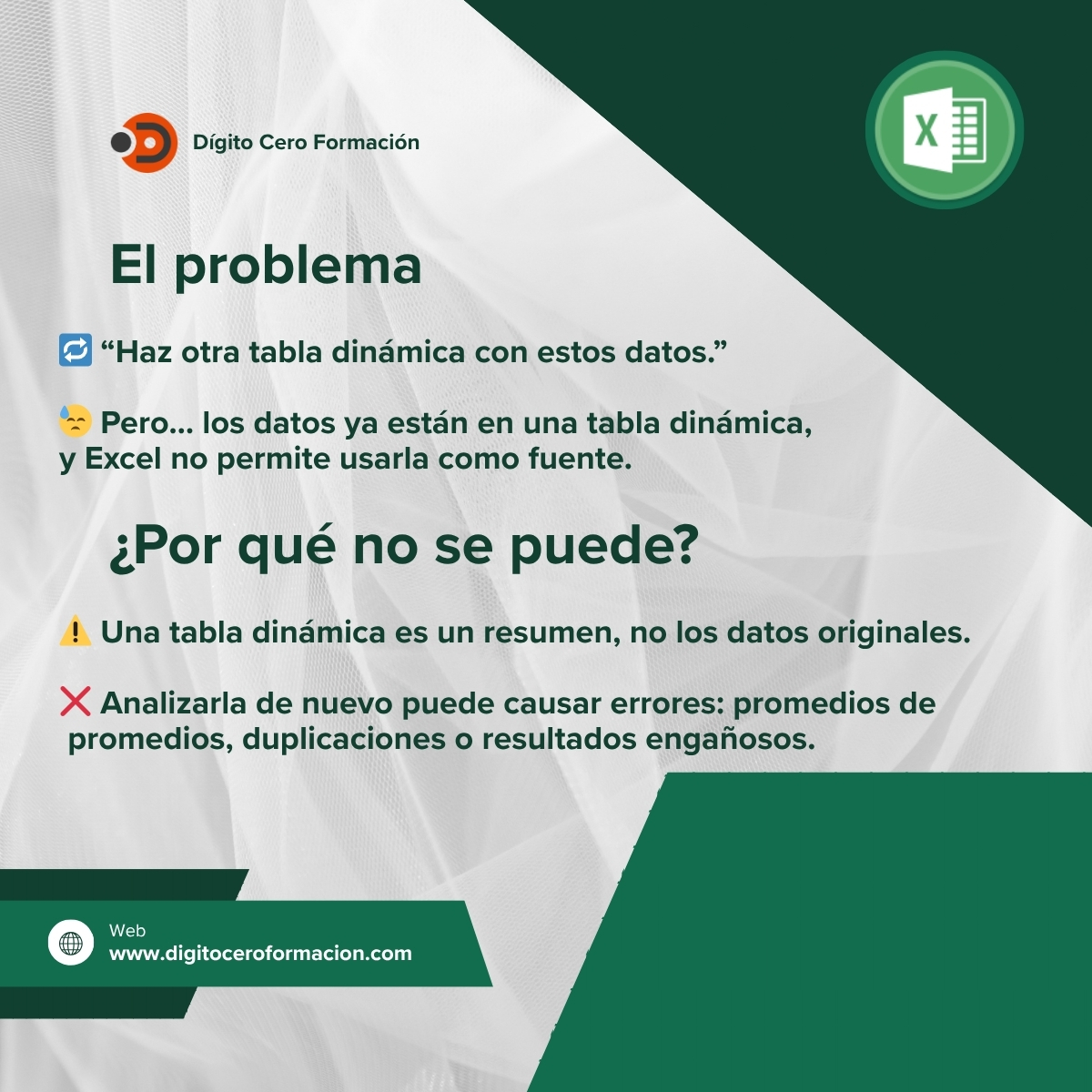 La razón es técnica, pero bastante lógica. Una tabla dinámica es, por definición, una agregación de datos. Ya ha agrupado, sumado, promediado o filtrado los datos originales, lo que la convierte en una estructura que no tiene la granularidad necesaria para un nuevo análisis.