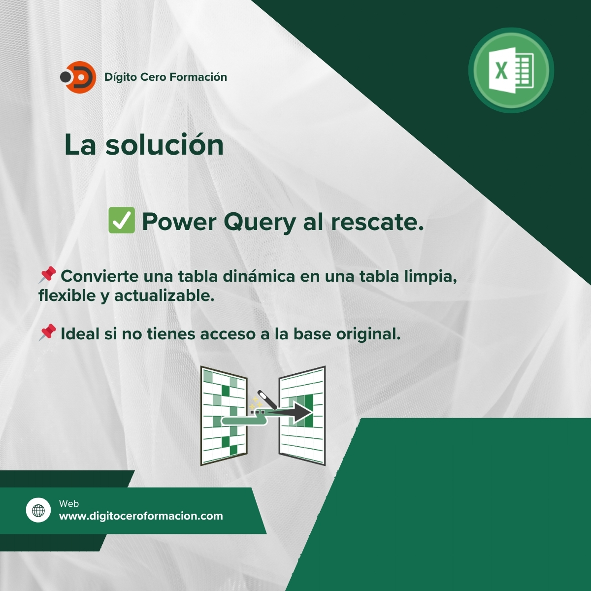 La buena noticia es que existe una solución elegante, potente y completamente gratuita que te permitirá transformar esa tabla dinámica en una fuente válida para crear otra: Power Query.