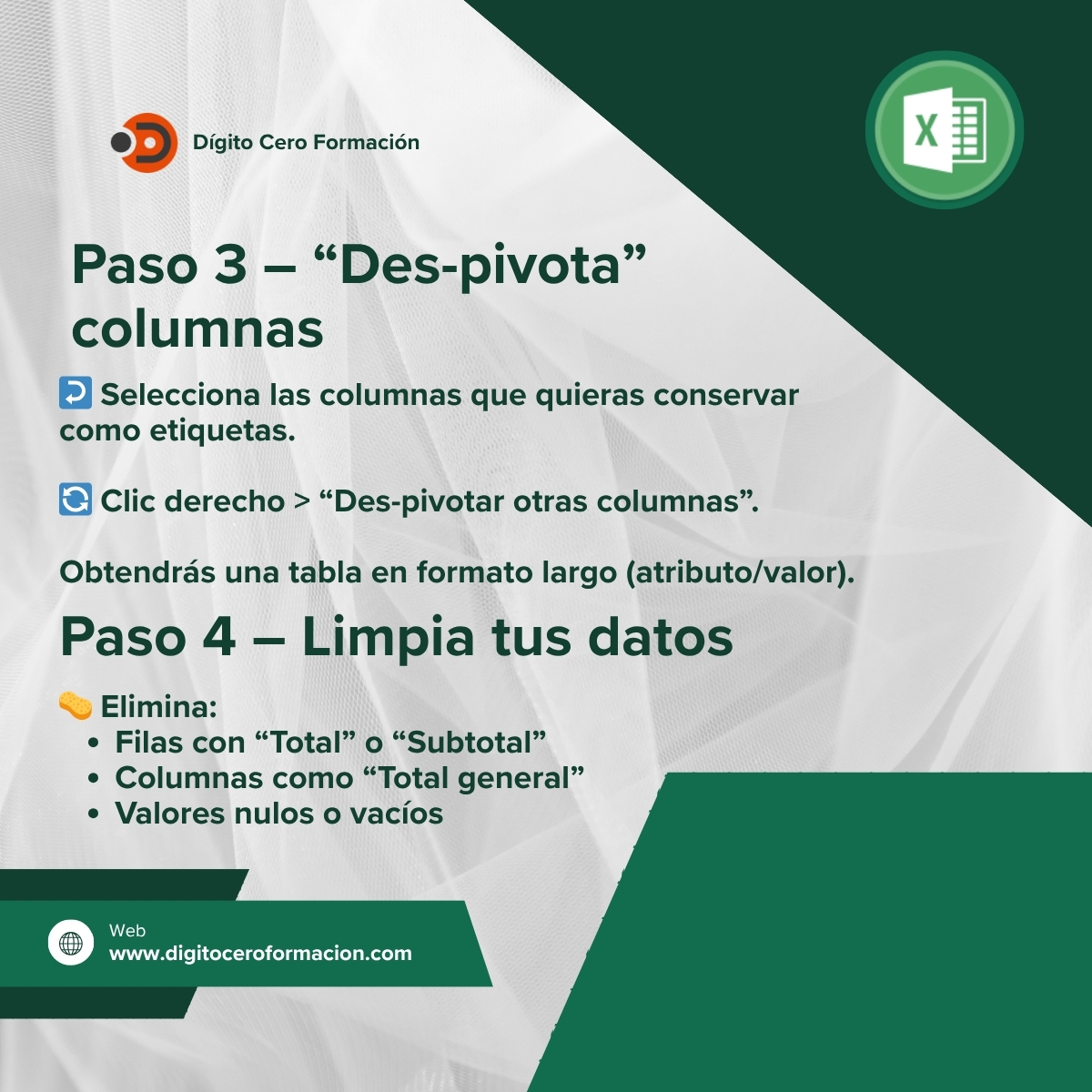 Power Query no solo convierte datos de una tabla dinámica en una tabla normal, sino que además te ofrece herramientas de limpieza, organización y automatización que te van a hacer la vida más fácil.